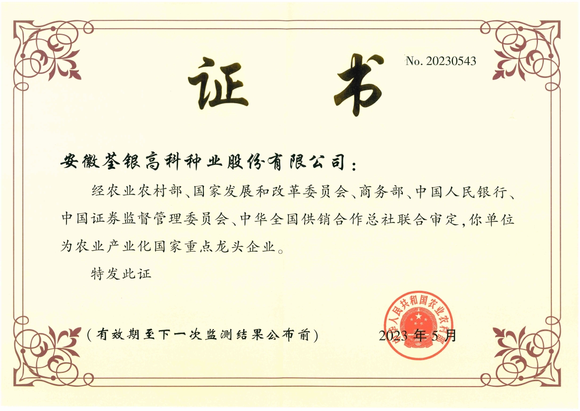 安徽荃銀高科種業(yè)股份有限公司是一家“以種業(yè)為核心、農(nóng)業(yè)服務(wù)為延伸、探索和創(chuàng)新農(nóng)業(yè)多元化發(fā)展”的現(xiàn)代高科技種業(yè)上市公司,證券代碼:300087。公司注冊資金9.47億元,系“中國種業(yè)領(lǐng)軍企業(yè)、農(nóng)業(yè)產(chǎn)業(yè)化國家重點龍頭企業(yè)、國家高新技術(shù)企業(yè)、農(nóng)業(yè)部首批農(nóng)作物種子育繁推一體化企業(yè)、中國種業(yè)信用明星企業(yè)"。在國內(nèi)控股子公司20多家,在國外設(shè)立分支機(jī)構(gòu)4家,良種銷售至全國20多個省(市、區(qū)),出口覆蓋20多個國家與地區(qū),種業(yè)綜合實力、雜交水稻研發(fā)、推廣及海外業(yè)務(wù)規(guī)模均居全國種子企業(yè)前2位。